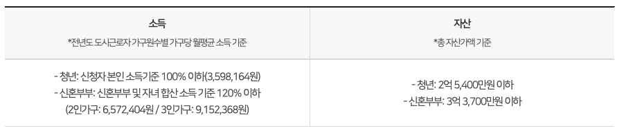 - 신혼부부: 신혼부부 및 자녀 합산 소득 기준 전년도 도시 근로자 가구 원수별 가구당 월평균 소득의 120% 이하