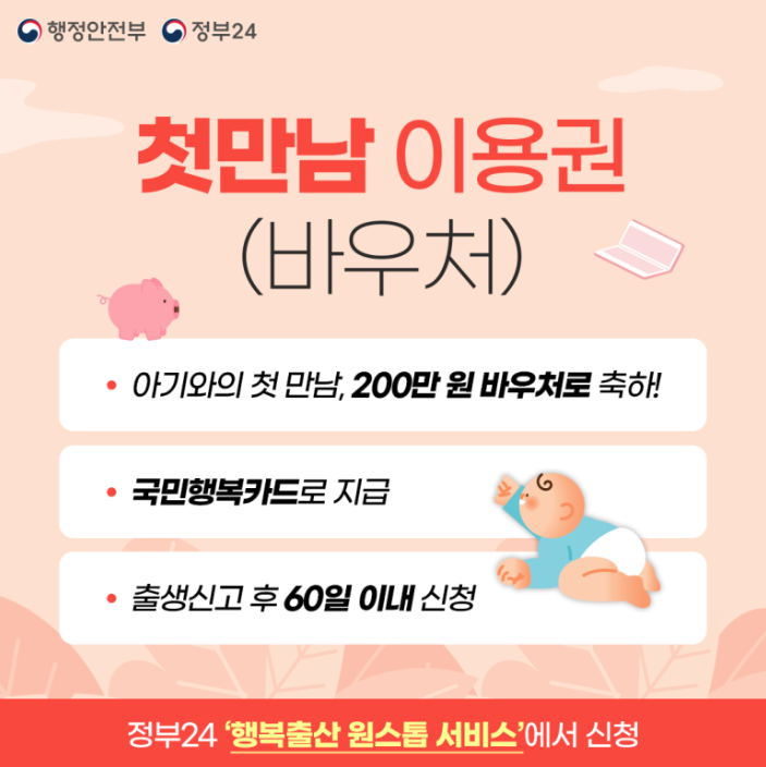 | 첫만남이용권 | 출생아 1인당 200만원 바우처 | 출산가정 | 2022년 이후 출생아 |