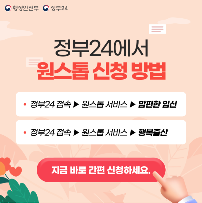 | 행복출산원스톱서비스 | 출산 후 정부 혜택 통합 신청 | 출산가정 | 정부24에서 가능 |