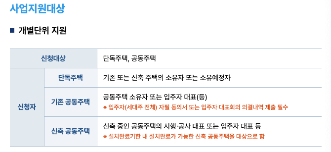 주택지원 태양광, 태양열, 지열, 소형풍력, 연료전지 등의 신·재생에너지원을 주택에 설치할 경우 설치비의 일부를 정부가 지원하는 사업 지원대상 개별단위 지원 개별단위 지원 관련된 표로