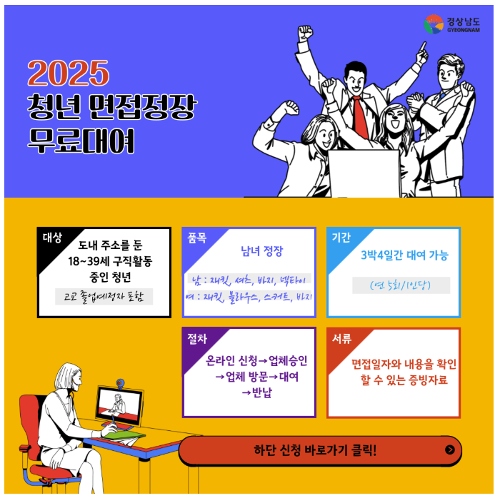 여러분, 면접을 준비하면서 정장을 빌릴 곳이 없으셨나요? 2025년부터 경상남도에서 시행되는 청년 면접정장 무료대여 사업을 통해, 경제적 부담 없이 면접에 적합한 정장을 대여하실 수 있습니다.