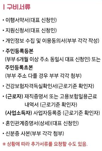 📑 제출서류: 혼인신고서, 주민등록등본, 고용증빙(또는 사업자등록증), 통장사본 등